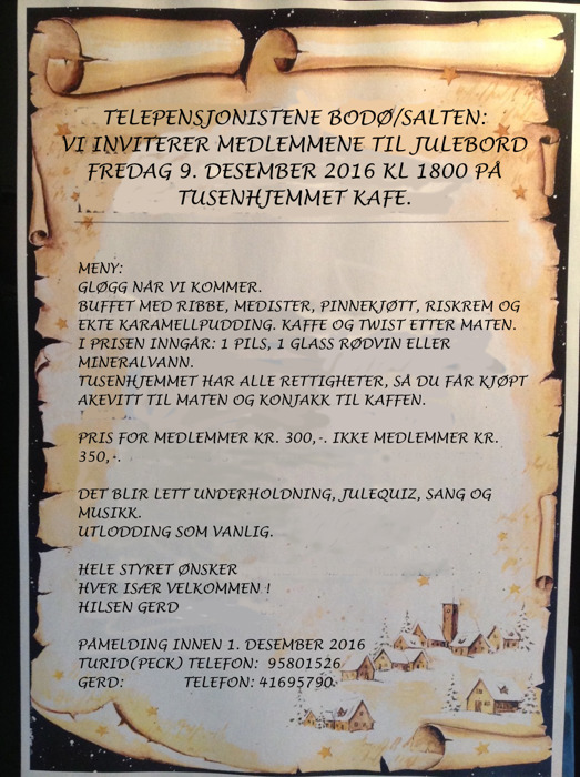 Etter «Nordnorsk julesalme» ble det matservering. En rikholdig buffet med tradisjonell julemat som smakte fortreffelig (god kokk!), og drikke etter behag – inkludert «en lille en». Stemningen steg etter hvert betraktelig.